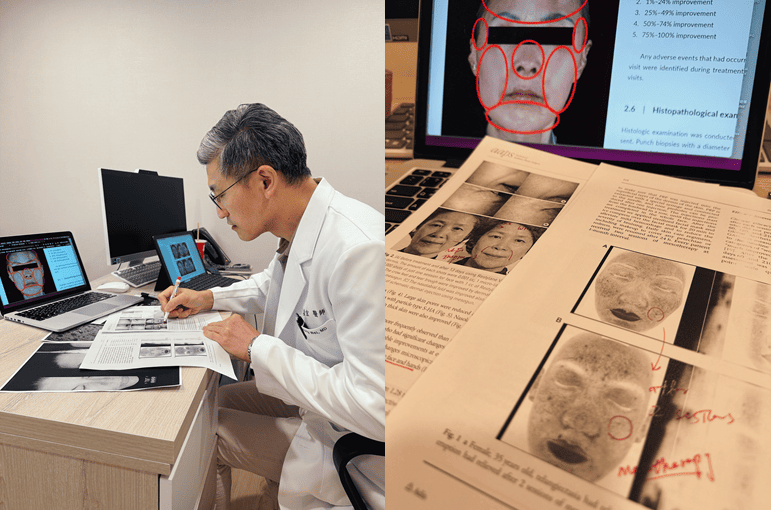 因此,總院長選擇了一條更艱難的道路──把臨床當研究,把健保當數據庫。從外院看診到成立健保皮膚科診所,他將每一位病人的治療前後照片、膚質變化、單次與複合療程的成果,完整紀錄下來;並將執業數十年累積至今的所有數據結合成資料庫,成為珍貴的水光療程治療依據。