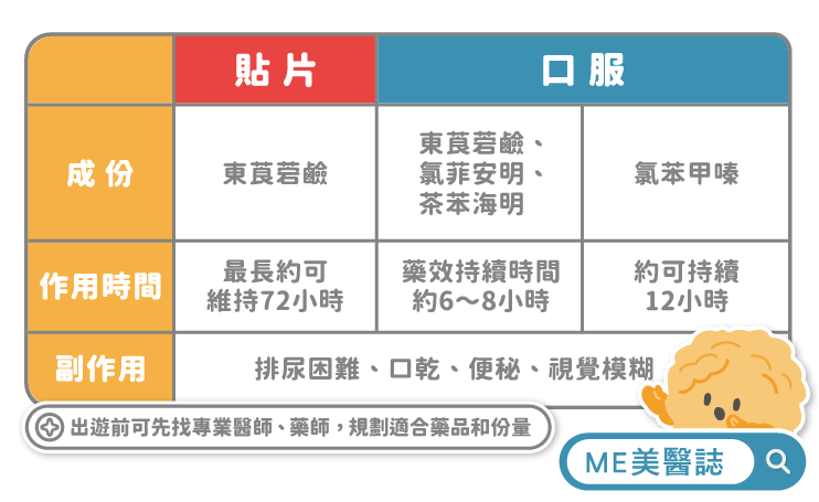 為貼片劑型,作用時間約72小時,通常為長效型,適合長時間搭機或搭船。