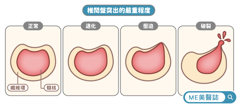當我們長時間維持不良姿勢,或是施加過大的壓力時,椎間盤內的髓核可能會往外擠壓,突破纖維環,形成所謂的「椎間盤突出」,如果突出的部份壓迫到脊椎內的神經,便會出現疼痛、麻木,甚至影響下肢的活動能力。
