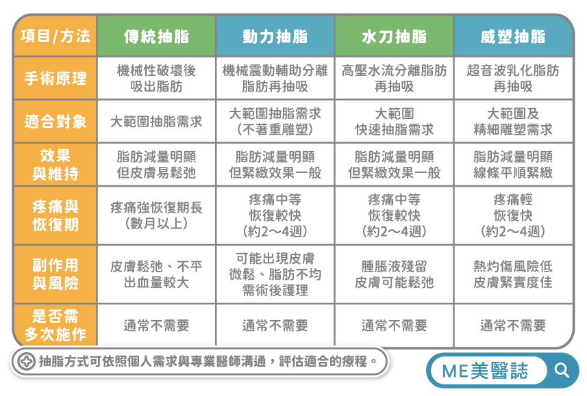 抽脂手術根據技術的不同,可分為傳統抽脂、動力抽脂、水刀抽脂和超音波抽脂,謝宇豪醫師以下分別說明其特色。