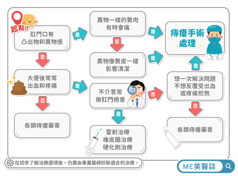 ● 如果僅是健檢發現有痔瘡、無不適症狀者,可以先使用藥膏或改善生活習慣等來做調整。